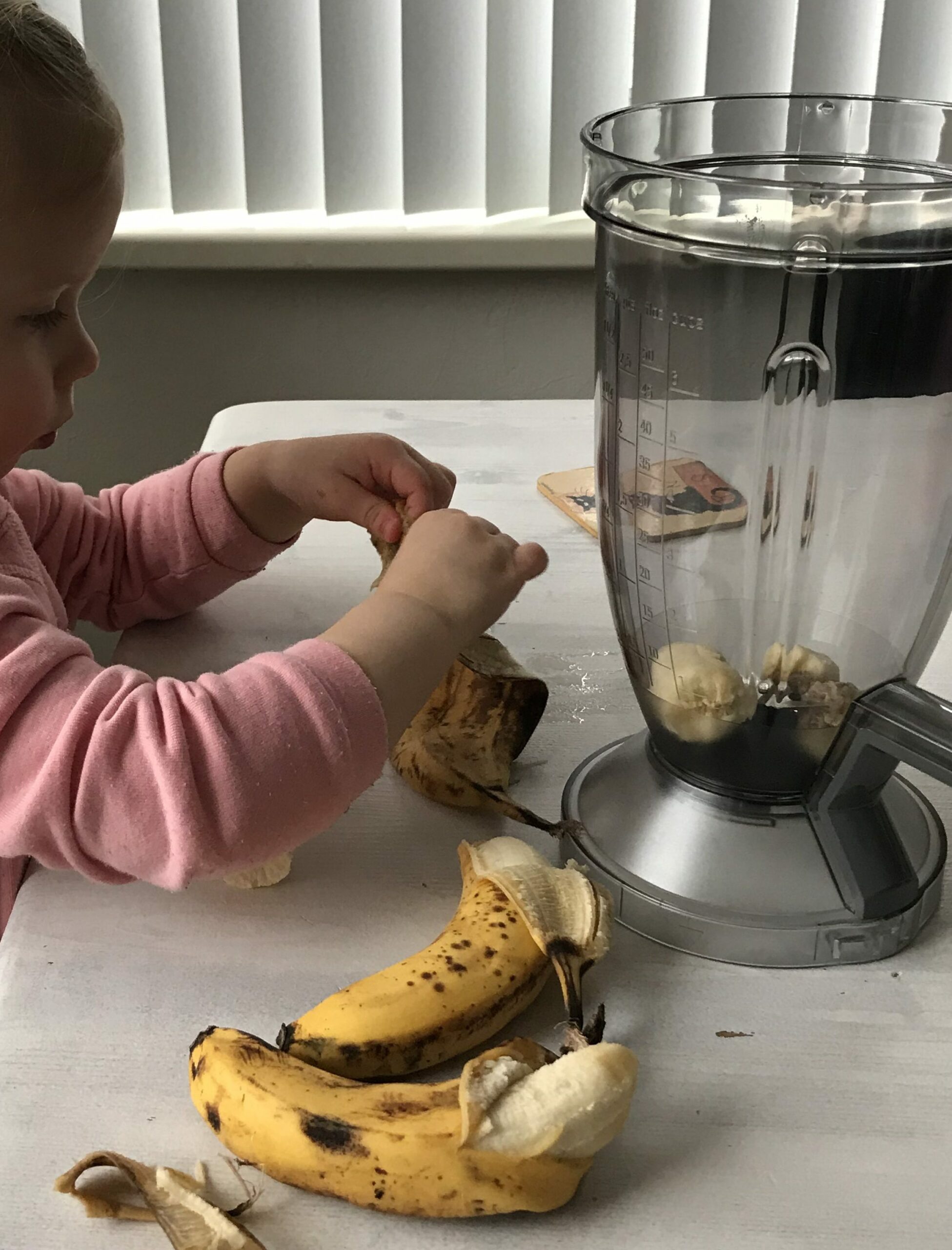 Het was koud en de regen bleef luid tikken tegen de ramen. Op de fruitschaal prijkten drie rijpe bananen en mijn kleine keukenprinses van 2 (en een half.. oei.. belangrijk dat moet er wel bij van onze jongedame) was thuis. De hoogste tijd dus om weer eens een lekker bananenbrood te bakken. Ik bakte het eerst volgens een recept van Pauline, maar mag graag zelf experimenteren. Te meer ook omdat amandelmeel best kostbaar is en ik af en toe een jongetje over de vloer heb wat onder andere geen noten mag. Ik gunde hem ook eens stukje bananenbrood. Anyway, handjes wassen, peuter aan tafel en gaan met die banaan! Wees niet bang als je zelf niet zo vaak iets bakt, het is echt supereenvoudig!